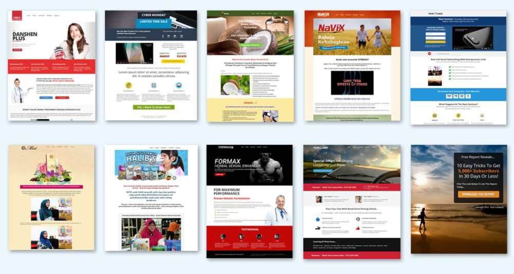 Template-template ini merangkumi pelbagai keperluan seperti antaranya : Web Jualan (salespage), Web Mengumpul Subscriber (Optin Page, Squeeze Page), Laman Pembelian (Order Page), Laman Hubungi (Contact Page), Coming Soon Page, Countdown Page, One Time Offer Page, Download Page, Thank You Page dan bermacam lagi..